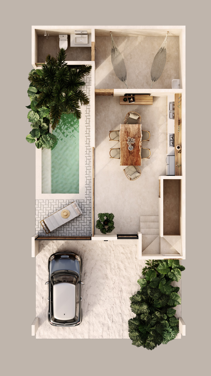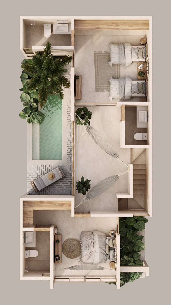 Cada townhouse constara de 3 recamaras con baño completo, cuarto de servicio con baño, alberca y un hermoso rooftop.